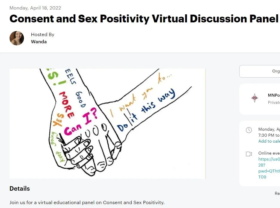 I am going to be participating on a panel about consent and sex positivity on Monday, April 18th, at 7:30pm CT. RSVP through meetup to get the login details!
