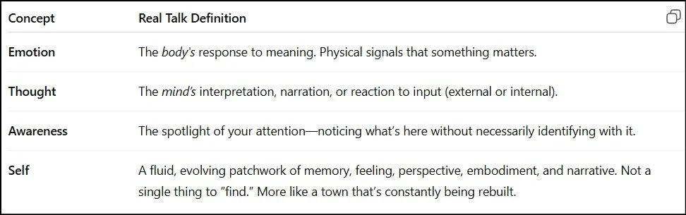 Map a world that was never mapped properly. You weren’t given clean, grounded categories for thought vs. emotion vs. self vs. belief.