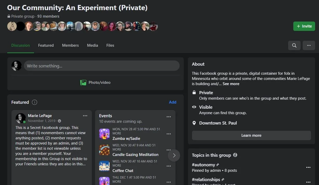 I've created a Facebook group for an experimental social thing I'm doing and, for the moment, am calling "Our Community" here in MN. If you want to join and check out some of the community events I'll be hosting in the future, join below!